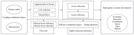To investigate the impact of the coupling coordination of HC and INFRA on HQED, this study quantifies HC-INFRA coupling coordination degree (CCD) and HQED indicators using panel data from 184 prefectural-level cities in China covering the period from 2011 to 2019, constructs and empirically examines the mechanism pathway of HC-INFRA CCD for urban HQED, and further explores the threshold effect of city scale (CS) and higher education institutions (HEI) on HC-INFRA CCD for advancing urban HQED. This study makes three main contributions. First, we construct a comprehensive evaluation system to quantify urban HQED, INFRA, and HC. Combining China’s new development philosophy and the concept of HQED, we construct an indicator system with 6 indicators to measure and examine urban HQED. From the perspective of urban INFRA functionality, we constructed 9 dimensions and 18 indicators to measure the level of INFRA. Unlike the majority of previous studies that have used education level to measure HC, this study takes a multidimensional approach by including age, employment, space, education, and security. Second, we present a new perspective for examining the drivers of HQED. In this paper, we adopt HC-INFRA CCD to examine the interaction relationship between HC and INFRA, and to theoretically analyze and empirically test the role mechanism of the CCD of the two in influencing HQED. Third, this study constructs a detailed path model (PM). At the theoretical level, this study examines FA and factor efficiency (FE) as significant paths through which HC-INFRA CCD promotes HQED. At the empirical level, this study refines the mediating variables specific to FA and FE and constructs a PM that includes six mediating variables of capital-economic allocation (CEA), labor-economic allocation (LEA), capital-labor allocation (CLA), labor efficiency (LRE), capital efficiency (CE), and land efficiency (LE). The empirical results contribute to a deeper understanding of the pathways of HC-INFRA CCD on HQED.