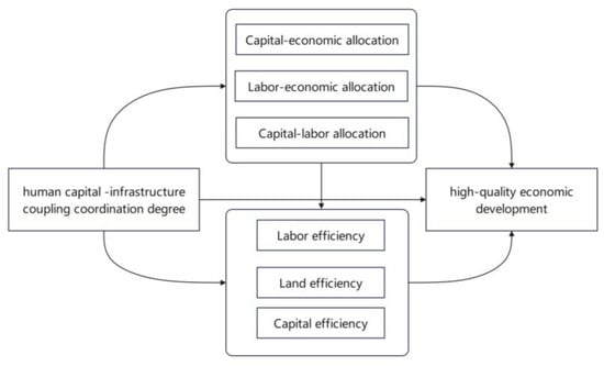 Following the reform and opening up, China relied on large-scale factor inputs to achieve rapid economic growth [1]. While social productivity increased dramatically, China’s economic efficiency remained low, which led to the waste of various resource elements, and made it difficult to achieve sustainable economic growth [2,3]. Development economics contends that the social division of labor to advance economic development cannot be separated from the scale of factor inputs, but the factor allocation (FA) coordination is more valued to achieve a sustained model of economic growth [4,5]. The 19th Communist Party of China (CPC) Congress Report asserted that China’s economy must be transformed from high-speed growth to high-quality development, and that the crude economic growth model was unsustainable. The 20th CPC Congress Report also proposed the promotion of high-quality economic development (HQED) as China’s primary goal, in order to reduce resource waste and thus realize sustainable economic growth. In the process of transitioning the nation’s economic development from quantitative increase to qualitative change, it is essential to focus on the interaction of internal factors within the system and emphasize the coordinated development of factors [6,7]. Human capital (HC) and infrastructure (INFRA) are the key factors for advancing HQED [8,9]. The state of HC-INFRA coordinated development and its impact on HQED is worthy of further in-depth research.