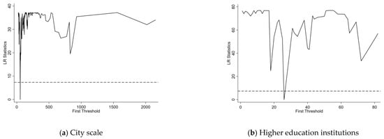 where CS and HEI are threshold variables. We use cities’ population size and the number of universities to measure CS and HEI, and YCS and YHEI are the corresponding thresholds. I (.) denotes the exponential function. α1–4 are the regression coefficients of HC-INFRA CCD. All other variables are consistent with Equation (9).