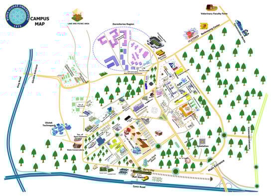 The university campus, which is the study area of the research, is the campus of Bursa Uludag University (BUU), Bursa, Turkey. Bursa is a city recognized as part of the UNESCO World Heritage List, where the Ottoman Empire was founded (https://whc.unesco.org/en/list/1452/, accessed on 7 August 2024). Founded in 1975, BUU consists of a total of 15 faculties, two colleges, fifteen vocational schools, one conservatory, four institutes, twenty-seven application and research centers, one research center, and five departments that operate under the supervision of the rectorate. While there are certain faculties and vocational schools scattered across the city, the main campus and the Rectorate of the University are situated in the Gorükle neighborhood of the Nilüfer district. The study area includes the educational and social spaces and open areas in BUÜ. The participants consist of students of the Faculties of Medicine, Economics and Administrative Sciences, Engineering, Architecture, Agriculture, Education, Science & Literature, Fine Arts, and Sport Sciences, which are located within the central campus (Figure 1, Figure 2 and Figure 3). The following subsections delineate the study area by examining features pertinent to student life at the university and the university’s built environment, encompassing both common spaces and those utilized by certain student groups.