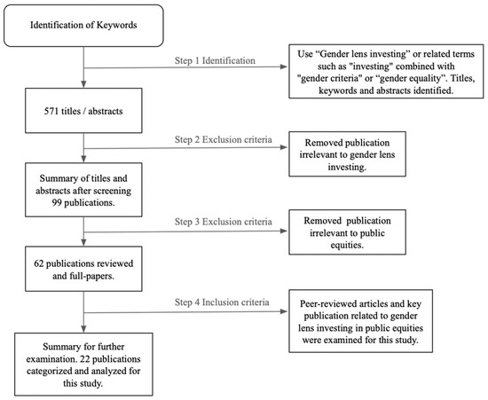 This structured approach ensures a comprehensive and systematic analysis of the existing literature on GLI to provide a better understanding of this dynamic field. The selection process was rigorous, involving an initial screening of titles and abstracts for relevance, followed by a full-text review to confirm suitability. Studies were included if they specifically addressed GLI or related variations in terms such as “gender equality” or “gender criteria” in the context of investment strategies. Eligible sources were limited to peer-reviewed articles, book chapters, and key industry reports published in English between 2009 and 2024. Studies were excluded if they focused primarily on broader ESG frameworks without a direct focus on GLI or diversity in the broader sense. A selection matrix was utilized to maintain consistency, efficiency, and transparency at each phase, ensuring relevance to the review. The four-step screening process used in this review (Table 1) helped to streamline the selection and ensure relevance at each phase.