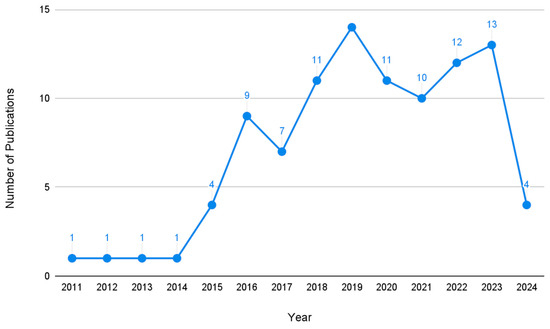 Number of gender lens investing publications per year from 2011–2024, as identified in this scoping review.