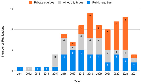 Publications on public equities, as well as general publications covering all equity types generally dominate the early landscape up through 2018. Thereafter, there is a shift in emphasis toward publications on private equities.