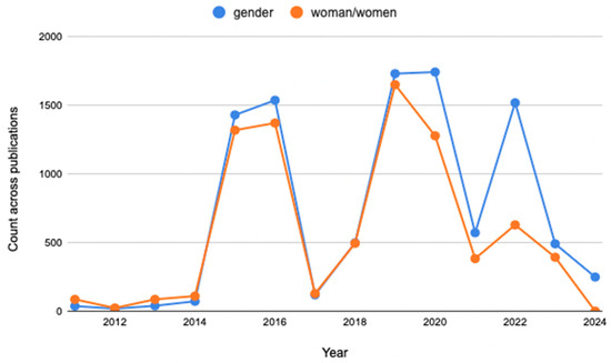 Count of “gender” and “woman/women” mentions across gender lens investing publications per year.