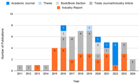 The development of the GLI literature over the years, as shown in Figure 2, demonstrates a significant upward trend in scholarly and practical publications. The graph shows a modest beginning in 2011, followed by a rapid overall expansion in publications between 2014 and 2019, with some fluctuation but an overall plateauing thereafter, reflecting growth in academic and industry interest in GLI. The trend is based on the analysis of 99 publications selected for this scoping review, which encompass academic journal articles, industry reports, and nonprofit publications, representing a comprehensive body of work on GLI [2,3,4,5,6,7,8,17,18,19,20,21,22,23,24,25,26,27,28,29,30,31,32,33,34,35,36,37,38,39,40,41,42,43,44,45,46,47,48,49,50,51,52,53,54,55,56,57,58,59,60,61,62,63,64,65,66,67,68,69,70,71,72,73,74,75,76,77,78,79,80,81,82,83,84,85,86,87,88,89,90,91,92,93,94,95,96].