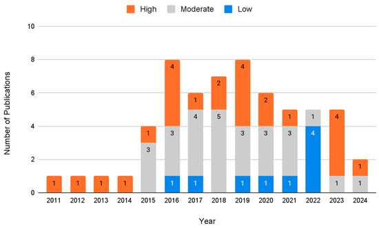 Figure 6 categorizes GLI publications in public equities from 2011 to 2024 by potential bias. Academic publications—including peer-reviewed articles, theses, and book sections—were marked as low bias. Moderate bias sources consisted of publications such as those co-authored by nonprofits and profit institutions. High-bias sources included industry reports from financial institutions that could benefit from providing consulting or advisory services.
