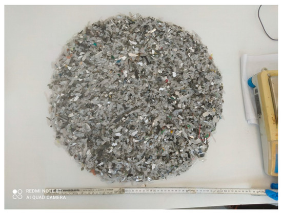 An SME recycler in Central Italy supplied the samples for bench scale experiments. The industrial facility collects and treats (by physical–mechanical treatment) around 30 tons of waste from WEEE, every day. The SME supplied to the Polytechnic University of Marche about 50 kg of crushed LCD panels (<10 cm), collected in big boxes and transported in plastic bags to university labs. The procedure reported below was implemented to achieve representative samples. A portion (4.820 kg) was placed on a clean table to form a cake with 7 cm thickness and 50 cm diameter (Figure 1); the cake was divided into 4 sections, and 2 of these fractions were selected to prepare a second cake with 3 cm thickness and 50 cm of diameter.