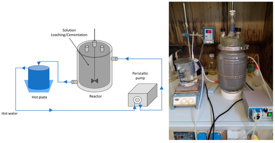 The leaching system consisted of three main components: a hot plate (Stuart SC162, Essex, UK), a 5 L jacketed reactor (the reactor is not a commercial product, but it was designed in the laboratory), and a peristaltic pump (Velp Scientifica™ SP 311, Usmate Velate, Italy) to ensure hot water circulation (Figure 2). More in detail, hot water, at 100 °C (used for both the leaching and cementation processes), was produced in a 2 L beaker placed on the hot plate and supplied to the reactor jacket with a 200 mL/min flow. The solution in the reactor reaches the requested temperature for leaching after 2 h (75–80 °C) and after 1 h (50–55 °C) for cementation. Thereafter, the hot water flows back from the jacketed reactor to the beaker, ensuring temperature maintenance (Figure 2).