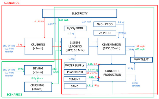 System boundaries considered for the LCA (Functional unit, a whole treatment of end-of-life LCD in the 5 L reactor). The red quantities are referred to scenario 1, green quantities to scenario 2, blue quantities are common to both scenarios.