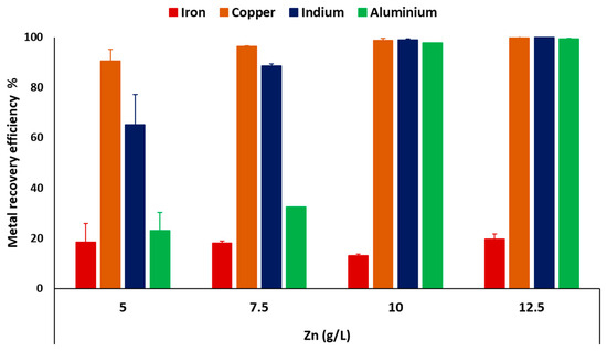 Figure 6 shows the indium concentration achieved at the end of each stage of the cross-current leaching process, along with the concentration of three main interferents: Fe, Al, and Cu. The results confirmed those previously observed at the lab scale [12] and during the development of the SCRIPT patent. Regardless of the process scale-up, an almost complete In extraction was achieved across the three leaching steps, with moderate extraction of the interferents. Al, Fe, and Cu were extracted with efficiencies of 12%, 5%, and 1%, respectively (Figure 6b). The tests also showed a volume loss around 10% due to evaporation phenomena and filtration steps. Therefore, the volume was restored by a fresh solution of 2M H2SO4, before the second and the third steps. The leaching solution from the third step of the cross-current process was used to determine the best operative conditions for In recovery by cementation with Zn. As showed in Figure 7, In recovery showed efficiencies higher than 90% with a Zn concentration above 7.5 g/L. However, even Cu and Al exhibited recovery efficiency greater than 90% with Zn concentrations over 5 and 10 g/L, respectively. On the other hand, Fe recovery remained at around 20%, regardless of the Zn concentration.