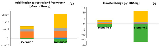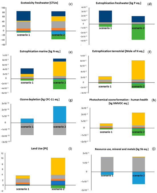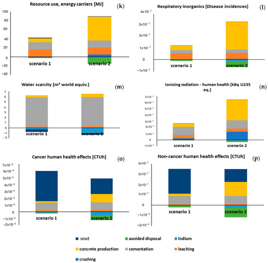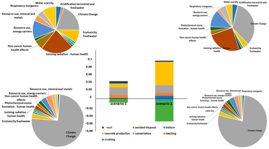 The results in Figure 8 aim to identify the environmental differences between the two scenarios reported in Figure 4 to assess the advantage/disadvantage of sample pre-sieving to increase In concentration. The results of classification and characterization phases show variable results according to the impact category. The possibility of an In pre-concentration in the treated waste is emphasized in the categories of resource use, minerals and metals, and the ecotoxicity freshwater, for the avoided depletion of primary resources (Figure 8c,j). Overall, the environmental credit due to both the recovered In and the avoided disposal of LCD panels is insufficient to balance the environmental impact of the process, with the exception of Scenario 2, in the categories of climate change and eutrophication freshwater (Figure 8b,d). These positive results are mainly explained by the substantial benefit of the avoided disposal, which is able to balance the environmental burden of concrete production (the main issue of scenario 2). This burden arises from the impact of the cement required to ensure the material’s technical properties. It is evident that the difference between scenarios 1 and 2 is due to the LCD amount used (3 kg with a low In concentration in scenario 1, vs. 18 kg to obtain 3 kg of high In concentration to treat in scenario 2). The lowest impact of Scenario 2 in the climate change category is also confirmed by the comparison with other innovative approaches reported in the literature, such as bioleaching followed by solvent extraction described by Falke and Höck [38]. The advantage of the SCRIPT process is explained by the short reaction time, which results in lower energy demand than the biotechnology. The different LCD amounts explain the variation between the two scenarios in the categories of ozone depletion and ionizing radiation (Figure 8g,n), where the effect of the highest energy demand for crushing is highlighted. Another interesting aspect is related to the decrease in washing water/waste LCD ratio, which affects the results of wastewater treatment (WWT). Indeed, the >1 mm fraction from sieving is sent to concrete production, without preliminary washing for sulphate removal. This reduction in wastewater represents a significant achievement from a sustainability perspective, as water treatment is one of the major weaknesses of hydrometallurgical recycling techniques [39].
