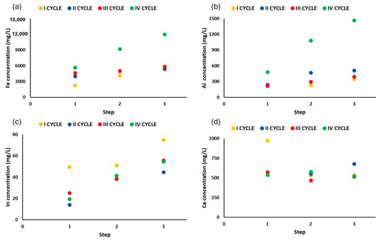 Metal concentrations ((a) Fe, (b) Al, (c) In, and (d) Ca) during the 3-step cross-current leaching process for the four tested recirculation cycles.