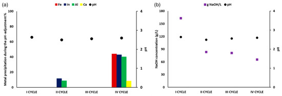 As concerns the further recovery steps, the results showed for the amount of NaOH necessary to increase the pH to the value of 2.5 decreased from 150 g/L, in the first step, to around 70–80 g/L in the second, third, and fourth cycles (Figure 12b). Furthermore, the amount of In that precipitated during the pH adjustment in the first three cycles was negligible (Figure 12a). On the other hand, in the fourth cycle, In recovery was around 40%, comparable to Al and Fe precipitation efficiencies.