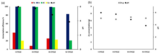 The cementation process, with 7.5 g/L of Zn, achieved an In recovery efficiency higher than 90% across all the recirculation cycles tested; the same was obtained without recirculation (Figure 13a). In contrast, Al and Fe recovery efficiencies decreased from 95 to 40%, in the first three cycles, to 20 and 0% in the last cycle, respectively, increasing the In purity in the final product. This was probably due to a lower pH increase in the fourth cycle, reaching a value lower than four, instead of a value higher than six, in the first two cycles (Figure 13b).