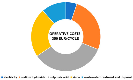 The economic assessment includes several variables, such as the energy and raw material costs and the fluctuations of the metal market. As concerns the operative costs, they were estimated around 350 EUR/cycle with four leaching steps, translated into 73,000 EUR/year, considering 210 cycles for year. The H2SO4 demand causes the highest contribution (34% of the OPEX), followed by NaOH and Zn (26% and 23%, respectively) (Figure 14). This cost distribution confirms the importance of wastewater recirculation, which increases the pH of the solution and decreases the NaOH demand. The additional recovery of Zn from the excess in the solid product could further reduce operating costs.