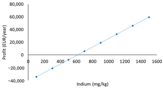 As previously observed, the cost-effectiveness of the process is connected to the In concentration in the starting waste. The trend in the ideal concentration, which makes the process sustainable, is closely linked to market fluctuations. For example, in recent years, the indium price fluctuated from 280 EUR/kg (requiring a concentration of 1200 ppm) to 400 EUR/kg in July 2024. Under these economic conditions, also described in paragraph 2.5, 600 ppm is the concentration able to produce a profit, making the innovative process sustainable from an economic point of view also (Figure 15). The recovery of other metals, such as Cu and Al, is not economically viable. Given the current price of around 9 EUR/kg for Cu and 2 EUR/kg for Al [43,44], the additional cost of integrating a process for Cu and Al recovery is not sustainable compared to In, which has a price 40 times higher. Considering the importance of the identification of sustainable strategies for In recovery, additional efforts should be made in pre-treatment to obtain a higher In pre-concentration (along with mixing different waste with relevant metal content). In the study by Savvilotidou et al. (2019) [45], several pre-treatment methods (mechanical crushing and sieving, pyrolysis, a gravimetric method, thermal shock) were compared based on In concentrations and potential economic savings. The findings indicated that thermal shock is the most effective pre-treatment technique, achieving a maximum In pre-concentration yield of 77.4% [46,47,48,49]. However, the economic analysis confirmed that mechanical crushing and sieving is the most cost-effective option, followed by thermal shock and pyrolysis. These results suggest that further incorporating a pre-sorting step (e.g., thermal shock to separate polarizers) could be a promising solution to increase the starting In concentration in the LCD waste.