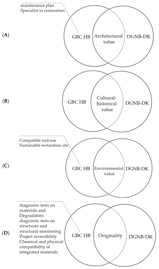 Figure 10. Comparison results in the social theme: (A) Safety ensuring, (B) Health, (C) Architecture, and (D) Transportation. - Values. A critical aspect distinguishing intervention in historical buildings from those in newly constructed ones is the preservation of inherent values throughout the intervention process. Notably, among the two certification systems, only the GBC-HB system explicitly incorporates certain values, both directly and indirectly, into its criteria. The preservation of originality, techniques, and the surrounding environment stands out as key values that the GBC-HB system takes into account. This unique feature highlights the system’s commitment to recognizing and safeguarding the intrinsic historical and cultural significance embedded in interventions concerning historical structures (Figure 11).