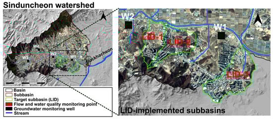 In this study, three urban sub-watersheds in the lower Sindun Stream (LID-1, LID-2, LID-3) were selected to evaluate the effects of LID techniques on securing baseflow and improving water quality (suspended solids, SS; total phosphorus, T-P) during dry periods. These selected sub-watersheds have urban areas comprising over 20% of their total area (Table 1) and are identified as regions where the reduction of streamflow during dry periods raises concerns about water quality and ecological degradation, thus necessitating measures for securing baseflow and improving water quality.