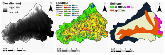 To operate the SWAT-MODFLOW model, input data are required for both SWAT (topography, land cover, soil maps, meteorological data) (Figure 2) and MODFLOW (groundwater flow analysis). We used a 5 × 5 m resolution Digital Elevation Model (DEM) created from 1:5000 digital topographic maps obtained from the National Geographic Information Institute (https://www.ngii.go.kr, accessed on 30 June 2024). A 1:25,000 land use map was acquired from the Environmental Geographic Information Service (https://egis.me.go.kr, accessed on 30 June 2024), and a 1:50,000 soil map was sourced from the Rural Development Administration (http://soil.rda.go.kr, accessed on 30 June 2024). All these datasets were resampled to a consistent spatial resolution of 30 m to ensure compatibility within the SWAT-MODFLOW model. Daily meteorological data, including precipitation, wind speed, relative humidity, maximum and minimum temperatures, and solar radiation, were collected from three nearby weather stations (Icheon, Janghowon, Baeksa) through the Korea Meteorological Administration (https://www.weather.go.kr, accessed on 11 May 2023). The model was set up for the period 2013–2021, including a three-year warm-up period.