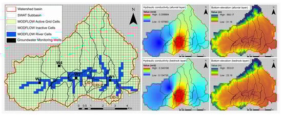 ModelMuse 4.2.0 [] software was used to define the modeling domain and to determine the spatial distribution of hydrogeological parameters such as hydraulic conductivity and storage coefficients. The model domain consisted of grid cells measuring 200 m × 200 m, creating 44 rows and 56 columns. The area outside the watershed was considered a no-flow condition and set as inactive grid cells. The aquifer structure of the watershed was simplified into a single alluvial layer and a permeable bedrock layer. The alluvial layer was treated as an unconfined aquifer, while the bedrock layer was modeled as a confined and unconfined aquifer in a transition zone. The bottom elevation and horizontal hydraulic conductivity of each layer were interpolated spatially from borehole logs, in-situ permeability tests, and slug tests [,] (Figure 3).