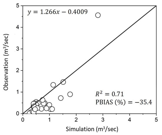 The parameters selected for model calibration were based on studies that used SWAT for streamflow simulation [,,]. The optimal values for these parameters are listed in Table 3. The calibration results for streamflow at the downstream point of the Sindun Stream watershed show an R2 value of 0.71 (Figure 4), indicating that the simulated streamflow is considered satisfactory when compared to the evaluation criteria proposed by Moriasi et al. []. However, the PBIAS value was −35.4%, suggesting an overestimation of the simulated streamflow compared to observations. This low PBIAS value can be attributed to the concentration of observations in low-flow conditions, with only one high-flow data point (approximately 5.4 m3 s−1). Although the model overestimated most low-flow observations, the high-flow point offset this variation, yielding a higher R2 but poor PBIAS. Additional high-flow observations could improve simulation accuracy by balancing the model’s calibration for both low- and high-flow conditions.