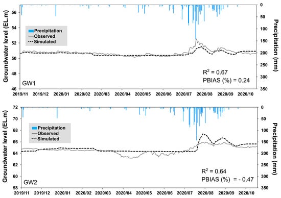 Figure 5 compares the simulated groundwater levels with the observed groundwater levels at GW1 and GW2 wells. The calibration results show R2 values of 0.67 and 0.64 and PBIAS values of 0.24% and −0.47%, respectively. These results indicate that the model generally performs well in simulating groundwater levels. Notably, the observed groundwater level fluctuations at GW2 were larger than those at GW1, likely due to the higher hydraulic conductivity of the aquifer, which makes the groundwater level more responsive. However, the model showed some difficulty in accurately capturing the rise and fall patterns of groundwater levels during periods with little rainfall compared to periods of summer rainfall. This is likely due to the fact that individual anthropogenic influences—such as water use in water curtain cultivation facilities and direct water abstraction from streams during farming seasons—were not accounted for in the model.