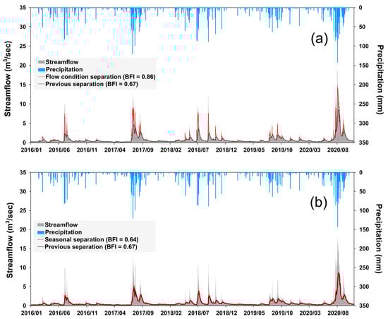 Results of baseflow separation results considering (a) flow condition and (b) seasonal characteristics. ‘Previous separation’ in each plot refers to a conventional baseflow separation over the entire simulation period.