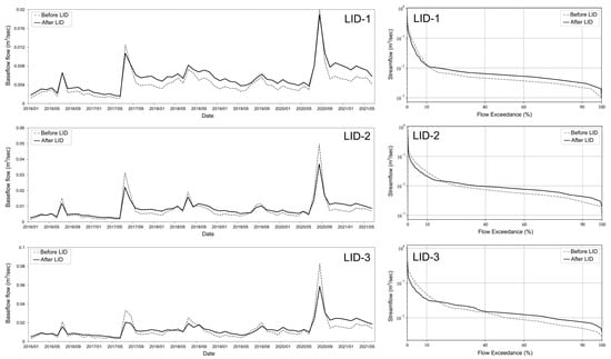 Figure 7 shows a comparison of the baseflow hydrograph and the FDC for streamflow before and after the application of LID techniques. As the baseflow increased due to the application of LID techniques in the target sub-watersheds, streamflow increased in all flow conditions except during the flood season. In contrast, the threshold flow (corresponding to the 10% exceedance flow on the FDC) for differentiating the flood season in each sub-watershed decreased by an average of approximately 27%, indicating the peak flow attenuation effect. The 10% exceedance flow threshold provides insight into the flood season’s peak flow levels, indicating the flow rate that is exceeded only 10% of the time. This threshold reduction highlights the LID techniques’ ability to mitigate peak flow events, which is consistent with findings from previous studies on rainfall retention through LID [,].
