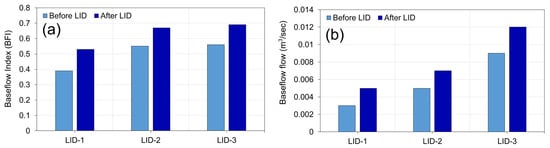 Comparison of (a) BFI and (b) dry season baseflow before and after LID application.