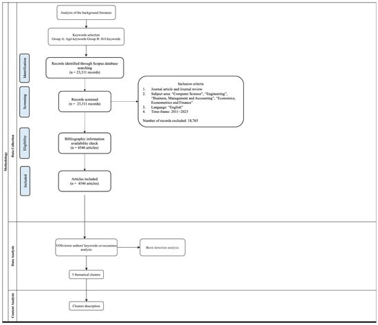 However, due to the structured nature of SLRs, they can generally be applied to analyze only a limited amount of literature. As a result, the scope of these reviews tends to be more focused compared to other approaches that utilize quantitative methods to analyze large volumes of academic publications, such as bibliometric analyses. Indeed, given the large amount of research published in the last years on Industry 4.0 and its applications in agriculture, a bibliometric analysis enables a comprehensive examination of current research trends and topics []. This method is suitable to systematically identify key areas of focus, prominent themes, and emerging trends within the literature, providing valuable insights into the current state of research in this increasingly important field.