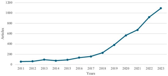 Figure 2 illustrates the number of articles published annually from 2011 to 2023. Initially, the number of articles remained relatively stable and low, with slight fluctuations between 2011 and 2017. A noticeable increase began in 2018, marking the start of a steady upward trend. From 2019 onwards, the growth accelerates significantly, culminating in a peak of over 1000 articles in 2023. This trend indicates a growing interest and expanding research activity in Agriculture 4.0 over the past decade, with a particularly sharp rise in the last few years.