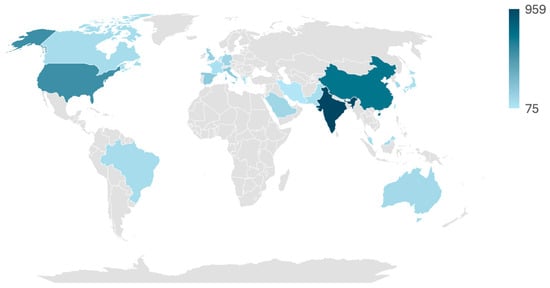 Figure 3 illustrates the top 20 countries with the highest number of publications on the topic of Industry 4.0 technologies in agriculture. The color gradient indicates the volume of publications, with darker shades representing a higher number of publications and lighter shades indicating fewer publications. China, India, and the United States are leading in the number of publications, with India having the highest count at 959 publications between 2011 and 2023. Other countries with substantial publication counts include Spain, Italy, and the United Kingdom. Those countries have between 200 and 230 publications in the field.