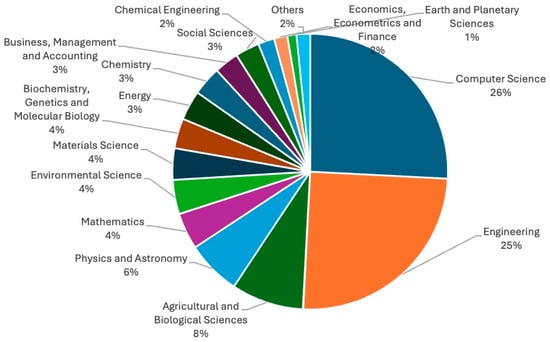 Figure 4 represents the distribution of academic publications on Agriculture 4.0 across various scientific disciplines. The largest segment of the chart, at 26%, is attributed to Computer Science, indicating a significant focus on the computational and data-driven aspects of integrating advanced technologies into agriculture. Following closely, Engineering accounts for 25% of the publications, emphasizing the importance of engineering solutions and innovations in this field. Agricultural and Biological Sciences make up 8% of the publications, reflecting research specifically targeted at agricultural practices and biological processes. The other 13 fields with smaller contributions indicate the broad and multidisciplinary interest in advancing agricultural practices through technological integration.
