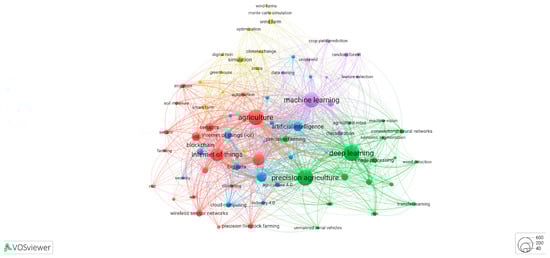 Keyword co-occurrence network of Agriculture 4.0. Each cluster is represented by a specific color.