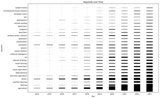 The burst detection analysis represented in Figure 7 illustrates the evolution of various keywords related to Industry 4.0 technologies and agriculture from 2014 to 2023. The thickness of the bars indicates periods when specific keywords experienced a significant surge in popularity, reflecting heightened research interest in those areas.