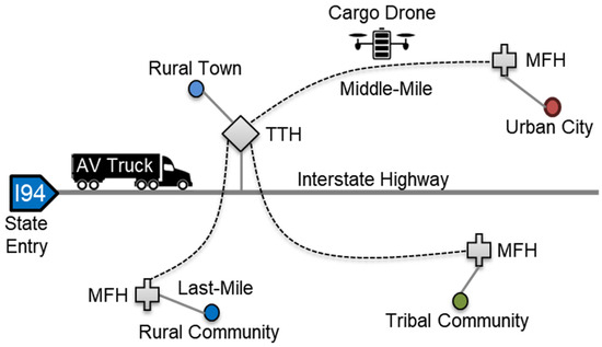 This paper presents a vision for AAM deployment, using a case study that blends the utility of autonomous trucks (ATs) and drones to serve urban and rural communities. This vision includes the establishment of multimodal truck transfer hubs (TTHs) to facilitate the transfer of freight between long-haul ATs and heavy-lift cargo drones. As illustrated in Figure 1, ATs or regular trucks that arrive from other states would deliver freight to a designated TTH. Heavy-lift cargo drones would then distribute freight to smaller multimodal freight hubs (MFHs) for last-mile deliveries to the nearest population centers. Regular or electrified vans or drones can complete the last-mile distribution. To achieve this vision, this research proposes repurposing and expanding a certain number of airports in the target state to serve as sites to develop TTHs and MFHs. Studies suggest that many small U.S. airports are underutilized [3], hence AAM deployments can leverage these existing facilities.