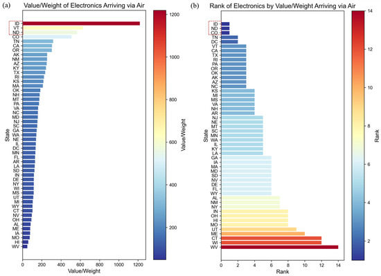 Figure 2b provides another view of the analysis results by listing the states in descending order that electronics rank by weight among all commodity categories forecasted to arrive via air. Values closer to 1 (higher rank) indicate that electronics have a higher value/weight ratio than any other commodities forecasted to arrive by air. The heatmap color scheme uses darker red to represent lower rank (higher values) and lighter blue to represent higher rank. The key observations are that North Dakota is among only three U.S. states where the value/weight ratio of electronics will rank highest among all commodities entering the state by air. This finding further justifies selecting North Dakota for this case study. The value/weight ratio of electronics ranks lowest among commodities forecasted to enter states such as West Virginia (WV), Wisconsin (WI), and Connecticut (CT).
