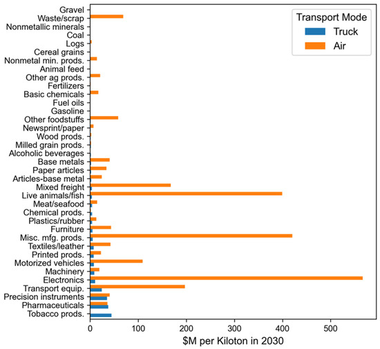 Figure 3 illustrates the value per kiloton of various commodities forecasted to enter North Dakota by truck and air in the year 2030. The figure lists the commodities vertically, while the horizontal axis represents the value in million dollars per kiloton. The blue and orange bars represent the value per kiloton transported by truck and air, respectively. The figure ranks the commodities by the value per kiloton transported by trucks, with tobacco products representing the highest value at the bottom. The key observation is that electronics have the highest value per kiloton when transported by air, significantly higher than when transported by truck. As expected, commodities with no significant air transport include gravel, waste/scrap, nonmetallic materials, coal, and logs. Trucks typically transport these, reflecting their low value-to-weight ratios, which make air transport economically unfeasible. These observations support the proposal that AAM could significantly impact the transport of electronics by shifting more of this high-value commodity to air transport, reducing truck traffic and enhancing efficiency and sustainability. Conversely, shippers transport low-value, high-weight commodities by truck, indicating the potential to use autonomous trucks in these sectors, which would be scope for future studies.