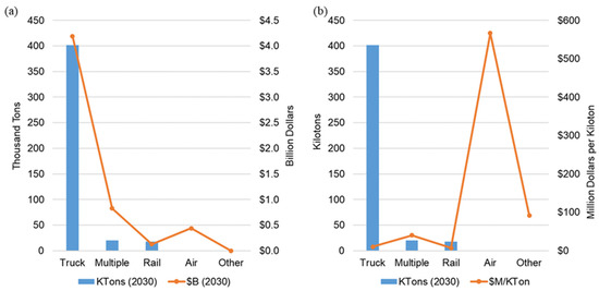 Figure 4 compares the total weight (blue bars) and value (orange line) of electronics forecasted to enter North Dakota in 2030 by trucks, multiple modes including trucks, rail, air, and other modes. Figure 4a shows the value in billion dollars ($B) for each mode. Figure 4b shows the value/weight ratio in million dollars per kiloton. The key observation is that truck transport will dominate the weight of electronics transported, with more than 400 thousand tons. For perspective, a typical semi-trailer truckload (big rig) can haul 20 tons [1]. Hence, this weight represents the potential for AAM to remove more than 400,000/20 = 20,000 semi-trailer truckloads annually from North Dakota roads. Another observation is that despite a significantly lower weight (less than 1000 tons) transported by air (not visible on the chart), the value is notably higher, close to $500 million, highlighting the current preference of standard air transport for exceedingly high value-to-weight ratio commodities. Together, these charts highlight the enormous potential for shifting the transport of electronics from other modes to air, particularly if the cost of using AAM modes can be lower.