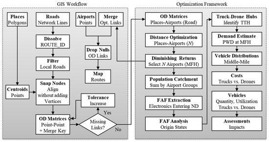 This research employs spatial optimization via GIS to estimate the number of MFHs for reducing the average travel distance for last-mile transport. The methodology is generalizable for application to any location. This approach offers distinct advantages over traditional optimization methods by incorporating geographic constraints, population distribution, and infrastructure availability directly into the analysis. The integration of diverse data layers—such as road networks, airport locations, and population centers—ensures that the selected hubs are not only theoretically optimal but also practically feasible in real-world applications. This GIS-based methodology provides a more precise and context-specific solution, enhancing the overall efficiency and sustainability of the logistics network and addressing the complex spatial interactions inherent in middle-mile transport. The subsections that follow demonstrate a U.S. application of the methodology based on the local data sources described.