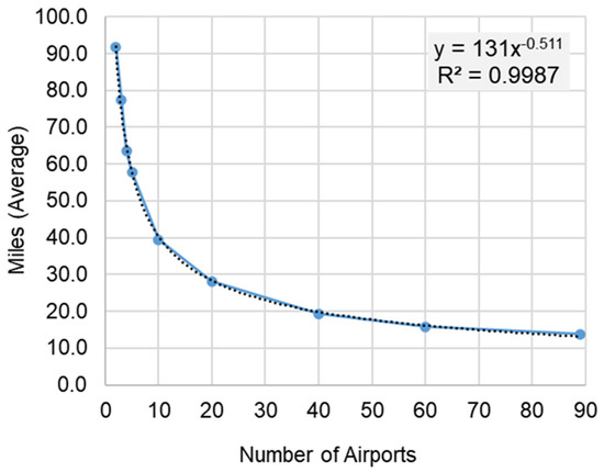 with an R-squared value of 0.999, derived using the built-in Microsoft Excel feature. This high R-squared value suggests that the model accurately describes the relationship between the number of airports and the average travel distance. Hence, Figure 6 inherently performs a sensitivity analysis by illustrating how varying the number of MFH locations impacts the total travel distance. This helps identify the point of diminishing returns, where additional MFHs do not significantly reduce travel distance, indicating an optimal number of MFHs for cost-effectiveness.
