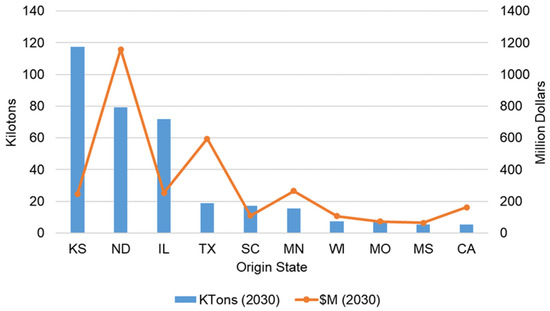 The commodity analysis utilized version 5.6 of the United States Department of Transportation, Bureau of Transportation Statistics (BTS), freight analysis framework (FAF) data to extract the forecasted weight and value of freight movements in 2030 [32].