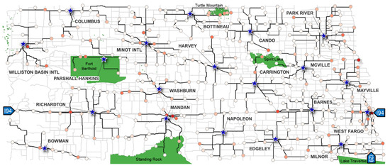 Table 1 summarizes the data sources employed in the ND case study. The Highway Performance Monitoring System (HPMS) contained shapefile data for all U.S. roadways [29]. The airport database contained points data on all official U.S. operational aerodromes [30]. The GIS workflow extracted 89 public-use airports in ND for MFH site selection. The places dataset contained polygon shapefiles representing all populated places registered by the U.S. Census Bureau [31].