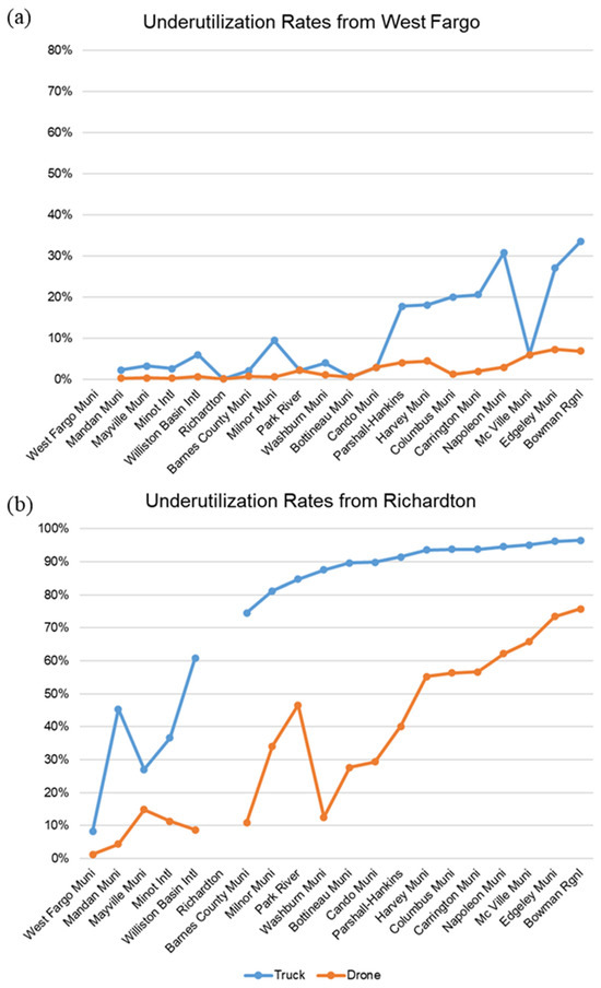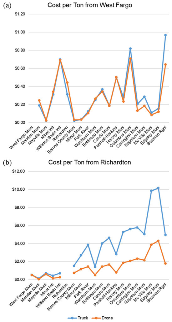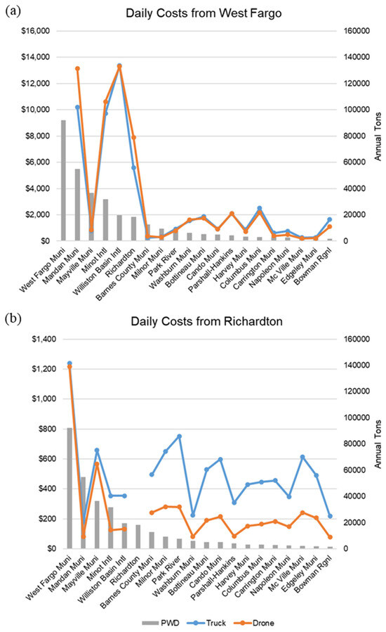 Figure 9 plots the forecasted daily transport costs from these facilities. The subplots compare the middle-mile transport costs from each TTH to the different MFHs. The horizontal axis lists the various MFH locations, and the vertical axis represents the daily transport costs for electronics. The blue and orange lines represent the transport costs by truck and drone, respectively. The gray bars and the right axis represent the PWD in annual tons. The order of the airports on the chart is by PWD rank. The key observation is that middle-mile transport costs by truck will be comparable to those of drones for the TTH at West Fargo that will process higher volumes of electronics. Without modulating the cargo drone payload capacity to maximize utilization, the average total cost for drones at this TTH will be approximately 8% higher than for trucks. Conversely, the cost for middle-mile transport by drones will be approximately 57% lower for the TTH at Richardton because the volume it will process will be much lower.