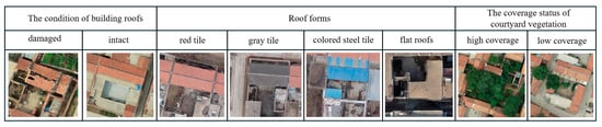 From the perspective of image recognition, the identification of architectural features based on UAV orthoimages primarily encompasses three aspects: the condition of building roofs (intact and damaged), roof forms, and the coverage status of courtyard vegetation [51]. Through summarization and refinement, in the traditional villages of the Shandong region, the forms of building roofs are categorized into two major types: double-sloped roofs and flat roofs. The double-sloped roofs can be further refined into three subtypes: red tile, gray tile, and colored steel tile (as shown in Figure 1). Additionally, influenced by traditional concepts such as Feng Shui, evergreen coniferous species are rarely planted in rural courtyards in the Shandong region, with a preference for more practical fruit trees. The courtyard vegetation exhibits distinct coverage characteristics during the growing season. Based on the aforementioned classification criteria, the building conditions can be further divided into six image recognition features, which serve as the basis for deep learning-based image recognition (see the category division in Figure 2).
