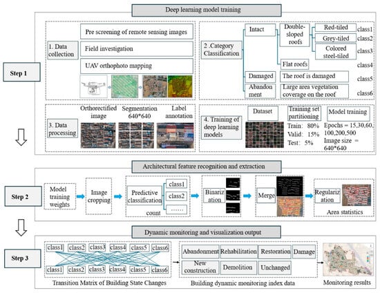 Initially, fundamental data was amassed via remote sensing images, field investigations, and UAV images, followed by the development of deep learning models. Subsequently, these models were deployed to identify and extract architectural features from the sample villages, leveraging image feature extraction to inform subsequent dynamic monitoring. Utilizing the extracted data, in conjunction with manual discrimination, the state of buildings and their transformations were categorized, statistically analyzed, and visually presented, facilitating the assessment and dynamic monitoring of traditional village buildings.
