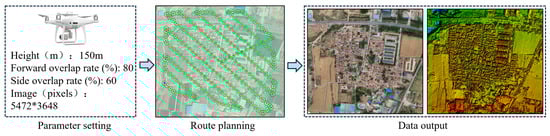 UAV images offer a higher planar data acquisition rate for upper areas such as building roofs, enabling the collection of multi-directional data information, and serving as an effective method for the investigation, evaluation, and change monitoring of traditional village architecture. The research team conducted field investigations of traditional villages within the jurisdiction of Shandong Province. Considering the limitations of the accuracy of remotely sensed images available to the public and the complexity of the traditional village architectural environment, this study utilized UAV photography to obtain orthoimages of 168 traditional Chinese villages. These images are used as the data source for the training set of the deep learning model, and the image data acquisition process is depicted in Figure 3.