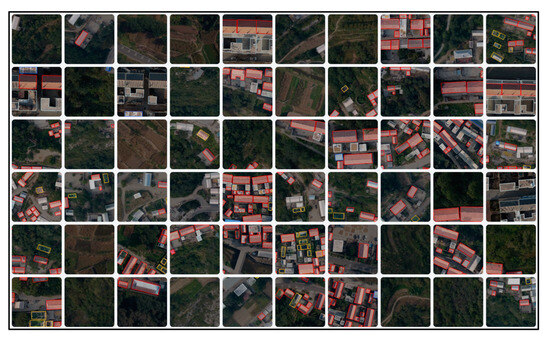 To meet the requirements for sample size and image resolution during the training phase of the YOLOv8 model, the output accuracy of the collected orthoimages was set to 10 cm. Subsequently, the original orthoimagery was cropped into 640*640 pixel images and different types of buildings and courtyards in the orthoimages were semantically segmented and annotated using the labeling software Labelme 2014 (Figure 4).