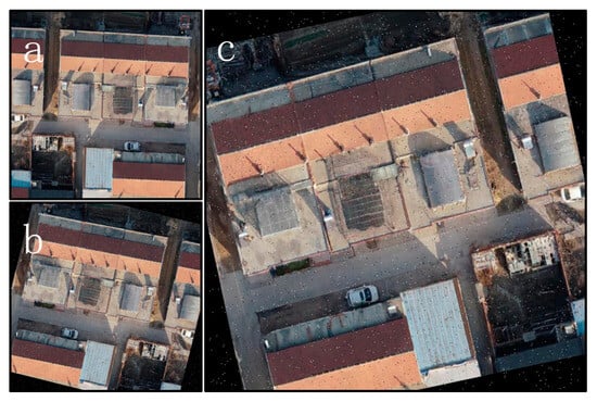 To achieve image enhancement and expansion of the training dataset, avoid unnecessary loss of image resolution during processing, and enhance the model’s generalization ability, the following data augmentation measures were taken: First, horizontal flipping was performed on each input image (Figure 5a); Second, random rotation was applied to the images (Figure 5b), with the angle varying between −15° and +15° to reflect the possible orientations of buildings in actual scenes; Third, blur effects were introduced (Figure 5c), with a maximum blur radius of 2.5 pixels, to mimic image blur caused by camera shake or rapid movement. Through the enhancement of the sample dataset, an average of three variants was generated for each original image, expanding the scale of the training set and improving the quality of the model’s training dataset through augmentation measures.