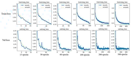 Following the training process described previously, and in conjunction with the comparison of the loss function across different training epochs (Figure 6), it can be observed that after 30 epochs, the loss function metric becomes stable, indicating effective model fitting. After 100 training epochs, the model reaches a plateau, and continued training leads to a decrease in overall accuracy due to overfitting. A comprehensive evaluation indicates that the training effect at the 60th epoch is superior to other batches, with the precision of detection boxes and instance segmentation on the training set stabilizing at 94.6% (Table 2), representing the optimal performance. Therefore, the training results from 60 epochs are selected as the predictive weights for the model. Concurrently, to enhance understanding of the model’s recognition process and for further analysis, the prediction results are visually processed. Figure 7 illustrates the visualization starting from the original.